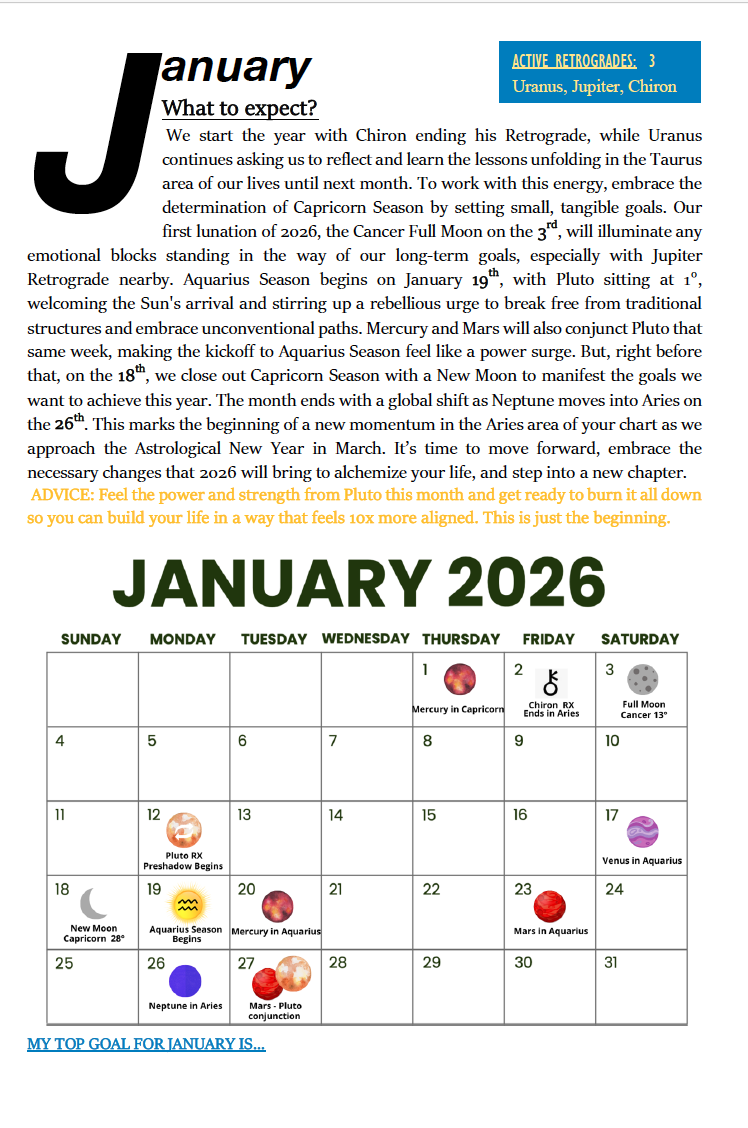 Move through 2026 with clarity (not chaos), optimal timing (instead of rolling a ball up hill), and awareness of what you are feeling and why, with our best edition yet!
