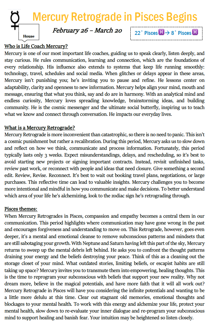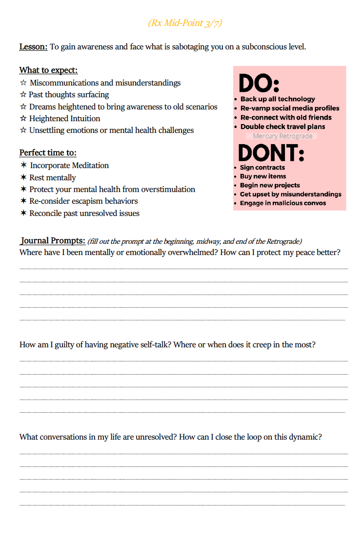Take note of what you can expect and what you should add to your calendar during the retrograde cycle. Honor the Do's and Don'ts to be guided away from the cosmic landmines. Fill out your journal prompts 3x (once at the beginning, again at the midpoint, and at the end) to see how far you have come in learning the lesson of the cycle.