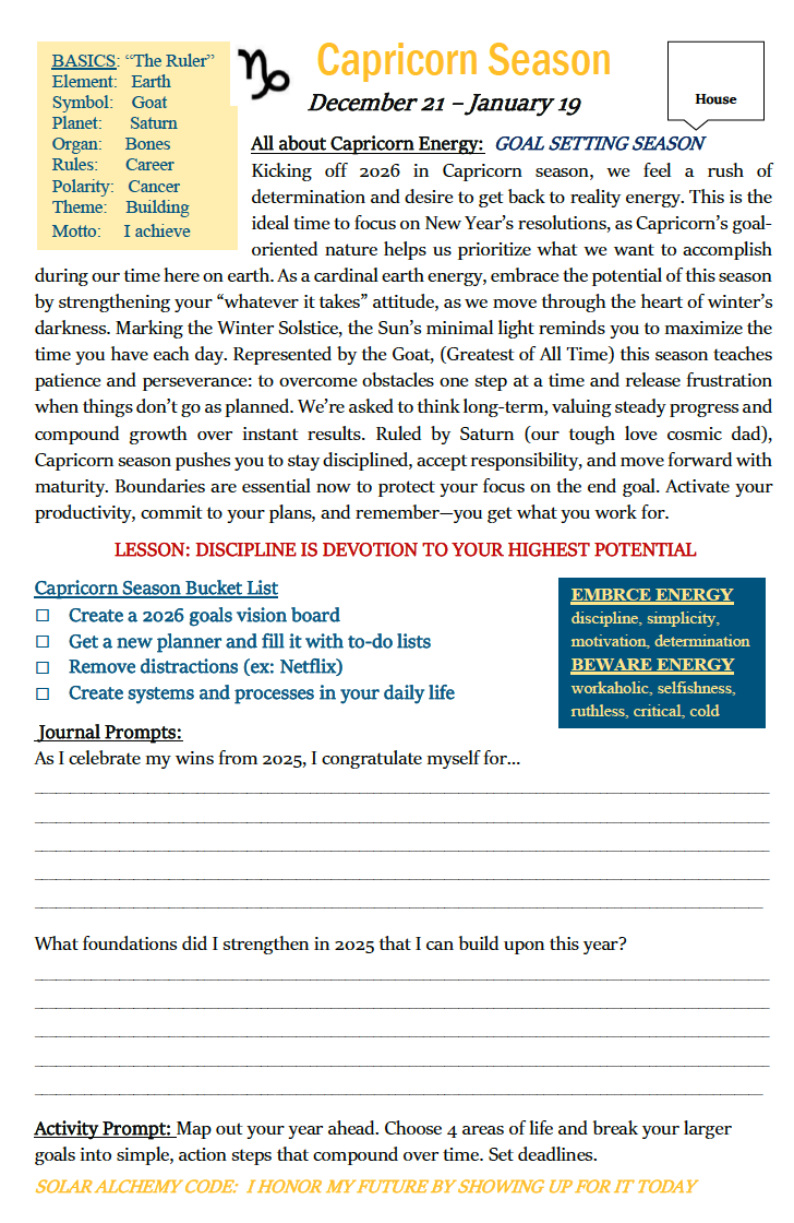 Align with the powerful seaons of the Sun as it infuses us with a specific zodiac energy to embrace for the month. Add the bucket list items to your calendar, schedule time for the Season's activity, and be mindful of the shadow energies creeping in!