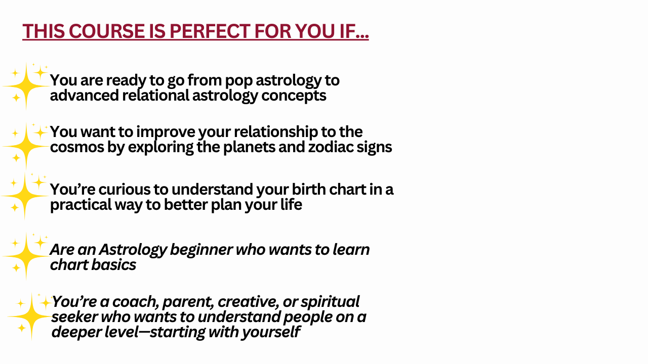 Through the lens of relational astrology, you’ll learn how to connect deeply with each part of your chart as a reflection of your soul’s unique design.