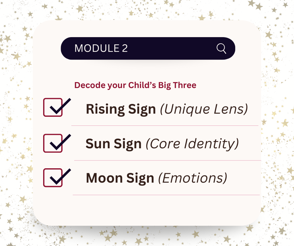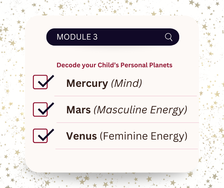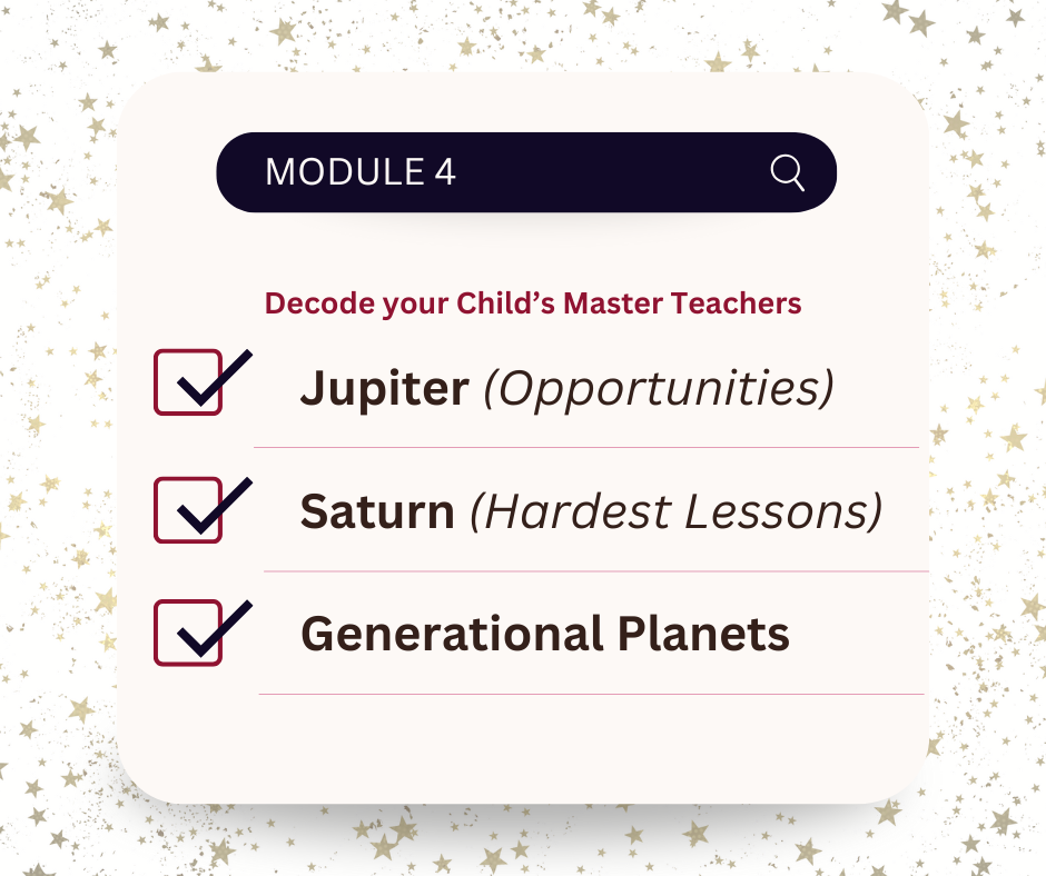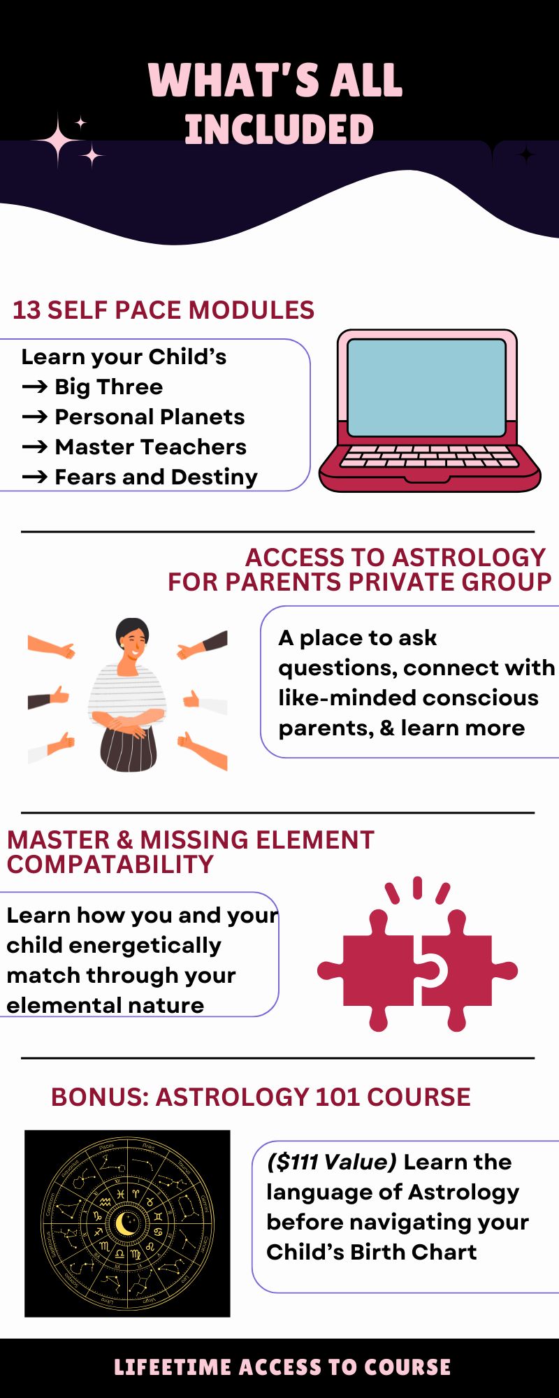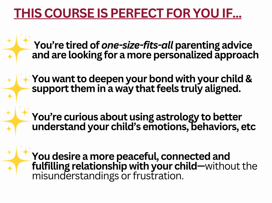 I will be breaking down the parts of your child's birth chart in the most simplest way so you can have tangible insights on exactly how to parent for your unique child. Bonus: you get to learn a little Astrology along the way!